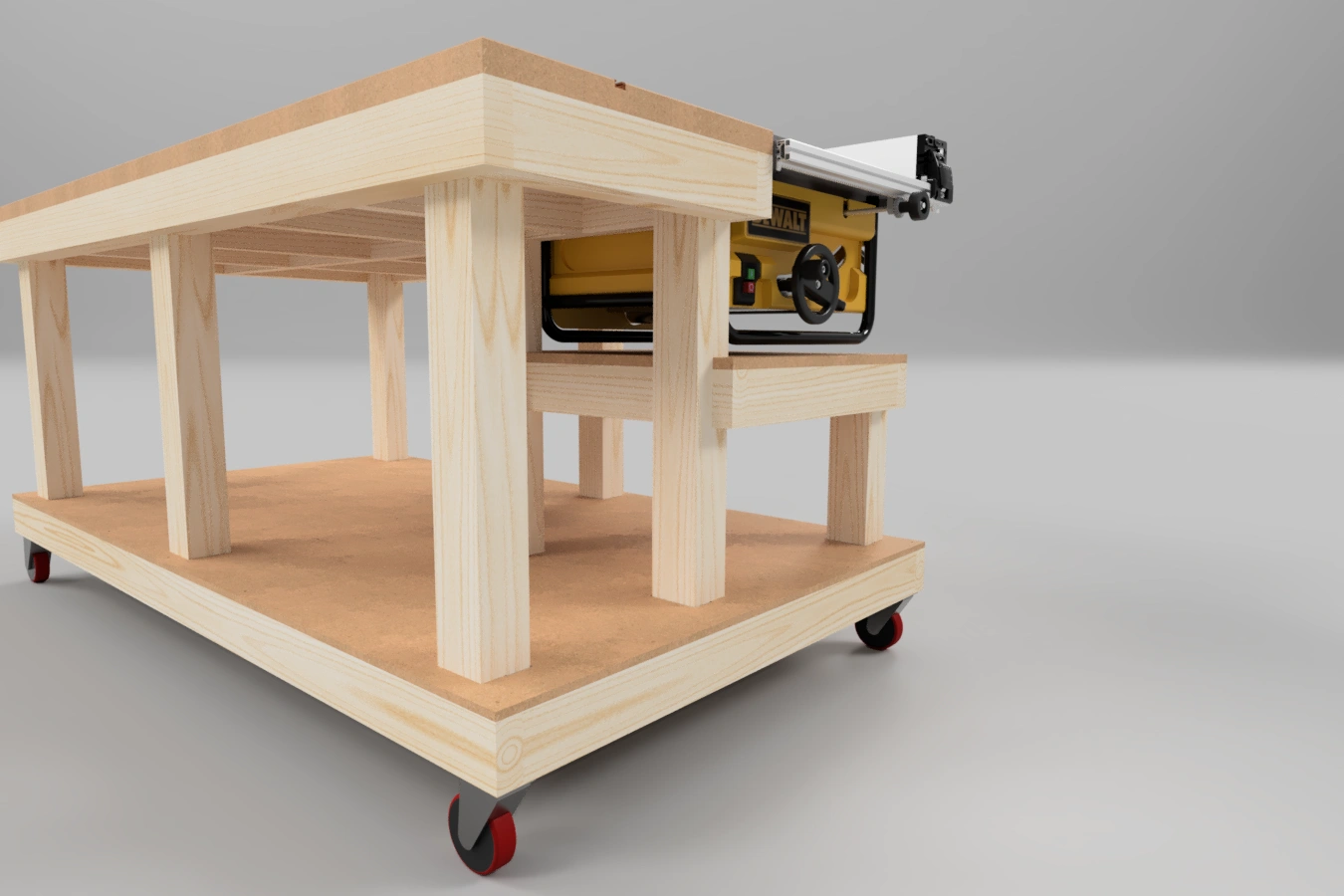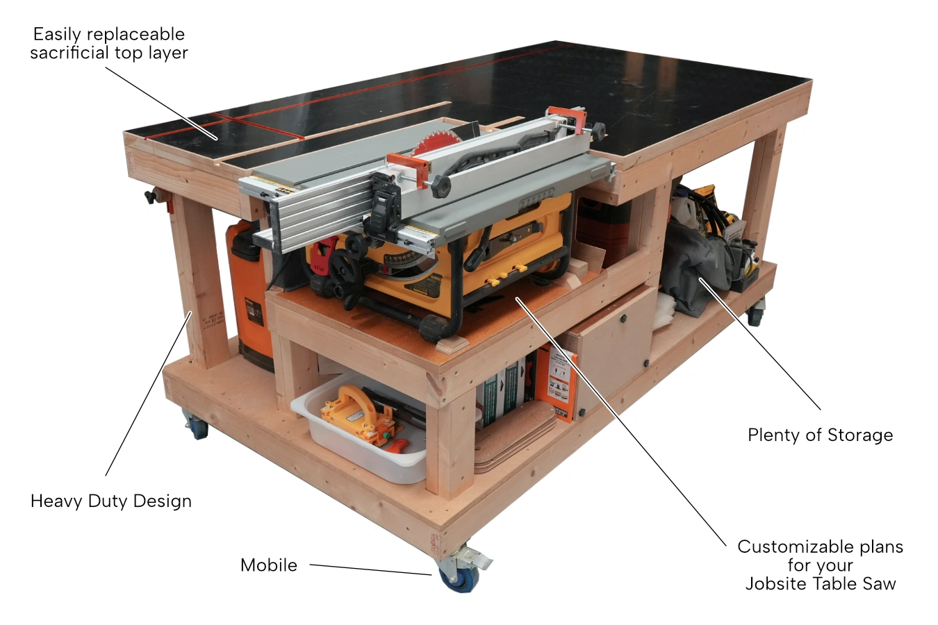 Transform your workshop with this Workbench and Outfeed Table, designed specifically for jobsite table saws. We’ve put this workbench through its paces for the past few years as our primary workbench and outfeed table. It’s extremely durable (seriously, hide under this if an earthquake ever hits), it’s mobile and very practical. It also has a double top layer, that can easily be replaced if it gets too marked up.